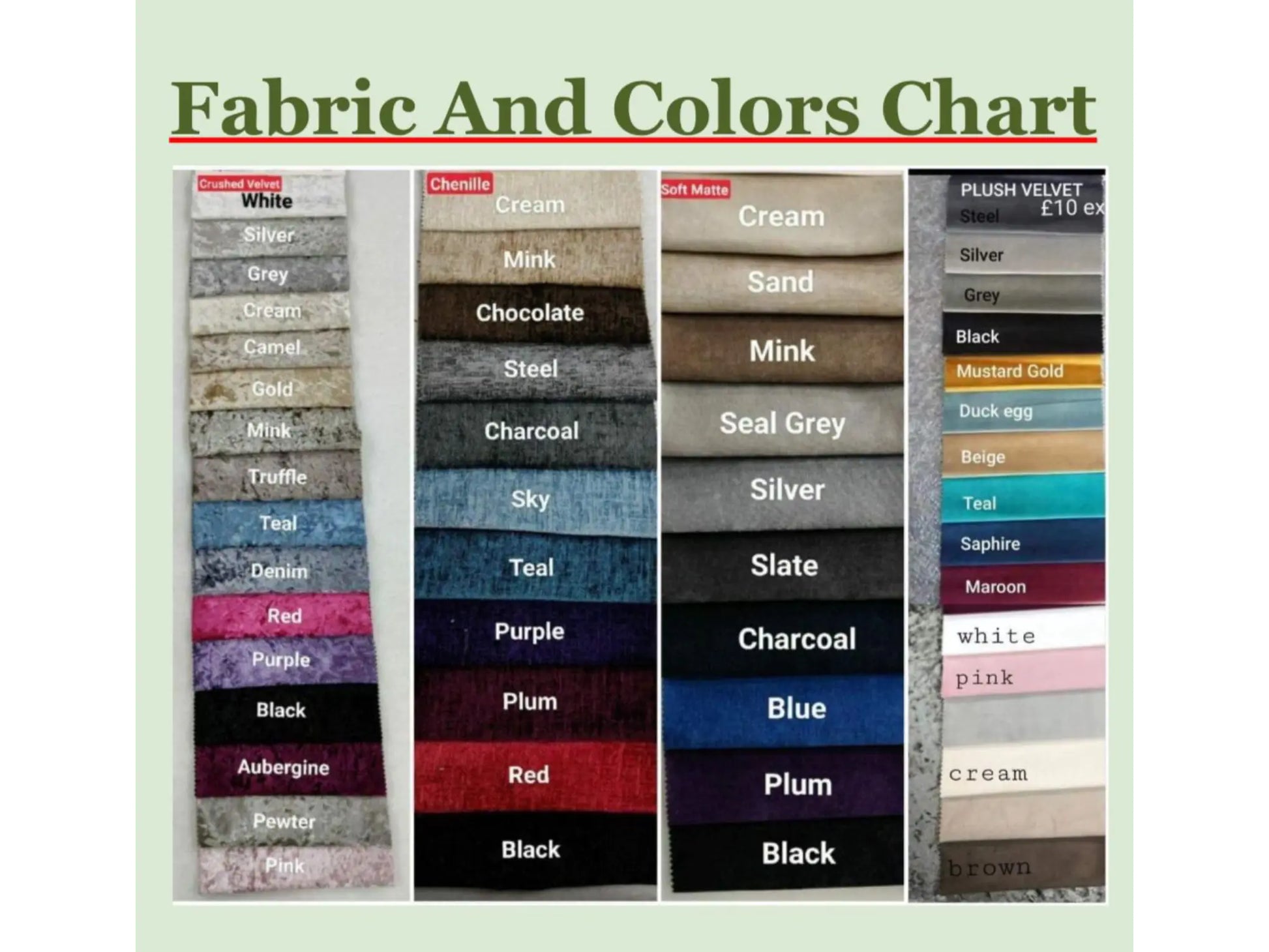 - Plush Velvet: If you seek the pinnacle of opulence, Plush Velvet is the ideal choice. With its rich texture and vibrant colors, this material is available for an additional £10:Steel, Silver, Grey, Black, Mustard, Gold, Duck Egg, Beige, Teal, Sapphire, Maroon, White, Pink, Cream, Brown.