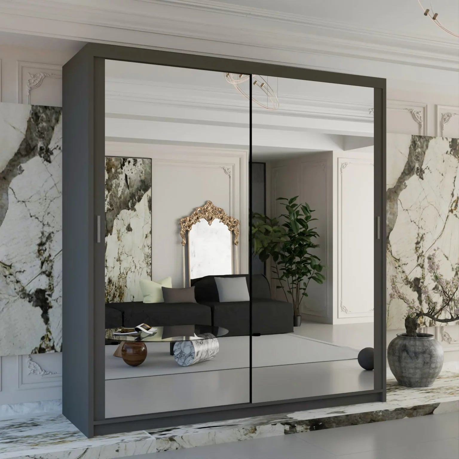 Elevate your bedroom with the sophisticated Milan Full Mirror Door Wardrobe. This modern wardrobe is designed to offer both elegance and functionality, featuring a full-length mirror that adds a touch of luxury while serving as a practical dressing mirror.